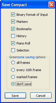 В результате компактного сохранения вы можете получить fm3-проект размером менее полумегабайта, при этом передавая в файле не только текущий мувик, но и все существенные данные, которые могут понадобиться получателю. Например, если вы работаете в соавторстве с другим ТАСером, нужно обмениваться не только Вводом, но и Маркерами, и Закладками. А Гринзону получатель файла сможет воссоздать самостоятельно, просто запустив просмотр в Тасэдиторе.