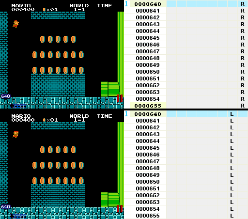 В данном случае участок был выбран недальновидно, и, как следствие, появился неверный критерий оптимальности ("на момент X = 200 счётчик кадров должен быть минимален"). Здесь концом участка должен быть момент, когда любое нажатие Вниз запускает анимацию ныряния Нужно было определить концом участка момент ныряния в трубу. Конечно, такие ошибки обычно замечаются при повторном просмотре готового мувика на свежую голову, но иногда ситуация менее очевидна, и обнаруживается только после опубликования. Во-вторых, в том же SMB после ныряния в трубу (мир 1-1) нужно добраться до выхода, находящегося справа. Казалось бы, требуется с первых мгновений начинать максимизацию скорости. Однако, как видно на картинке, в течение первой дюжины кадров правильнее всего будет зажать кнопку L, а не R, чтобы сначала приземлиться немного поодаль от стенки, через которую требуется перепрыгнуть. Если сразу зажать R, то Марио приземлится вплотную перед стенкой, и ему придётся прыгать вертикально вверх, обнулив всю набранную скорость. Эта особенность вовсе не так очевидна, если в качестве оптимизируемого участка вы выбираете промежуток от появления Марио до приземления. На таком маленьком участке критерий оптимальности наведёт вас на неверную последовательность кнопок. Здесь нужно выбирать участок от первого кадра появления Марио до момента преодоления угла стенки. К сожалению, даже опытные ТАСеры не всегда ставят правильные ограничения сразу. Иногда приходится передумывать и переделывать, выбрасывать результаты проделанных тестов и менять масштаб участка, заново проходить почти тот же самый момент в игре. |