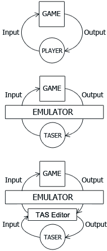Actual process of TAS optimization consists of editing Input and evaluating resulting Output. When TASer gets better result, he marks current Input as the best, until he finds an even more optimal Input. The final product (TAS movie) contains the best solution for every subtask.