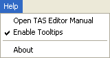 First, if you've already read the chapter 2 and understood the purpose of all GUI elements, you should disable pop-up tooltips (intended for newbies only). Go to the "Help" submenu of Taseditor main menu and uncheck the option "Enable Tooltips". Before doing it you may want to actually read all the tooltips by pointing the mouse cursor at different elements of TAS Editor window, and thus consolidate your knowledge of the GUI. |